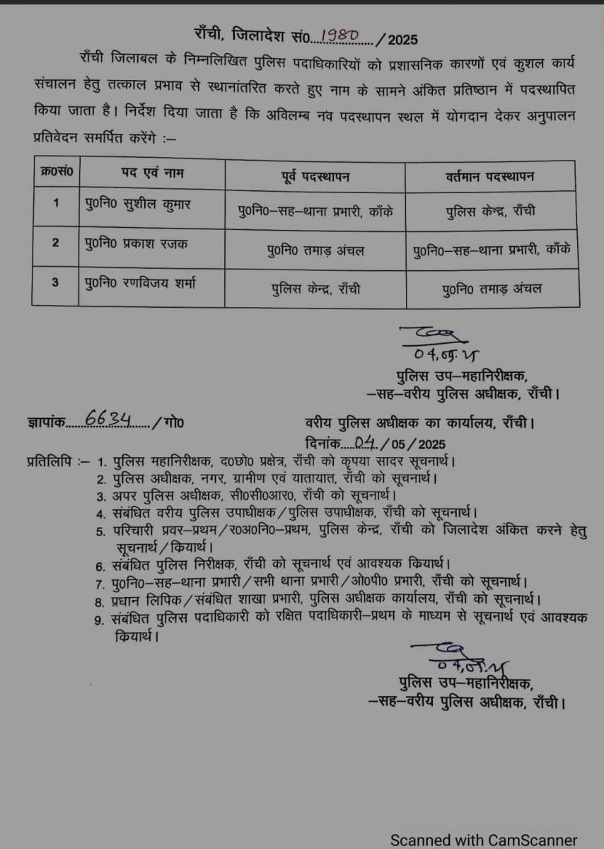 रांची पुलिस की ओर से जारी जिलादेश संख्या 1980/2025 में कहा गया है कि प्रशासनिक कारणों एवं कुशल कार्य संचालन के लिए तत्काल प्रभाव से कुछ पुलिस पदाधिकारियों का ट्रांसफर किया जा रहा है. इन्हें निर्देश दिया गया है कि जल्द से जल्द अपने नये पदस्थापन स्थल पर योगदान देकर अनुपालन प्रतिवेदन समर्पित करें.