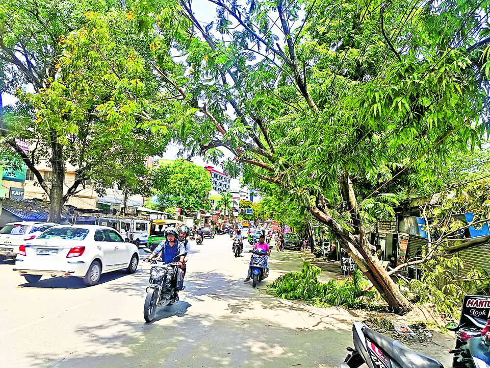 आंधी-पानी से क्लब रोड में एक पेड़ जड़ से उखड़ गया है. यह पेड़ बिजली तार के सहारे लटका हुआ है. दो दिनों से यही स्थिति बनी हुई है. ऐसे में यह पेड़ कभी भी वाहन चालकों पर गिर सकता है. इससे जानमाल का नुकसान हो सकता है. वहीं, पीस रोड में सड़क पर अब भी टहनियां बिखरी हुई हैं.