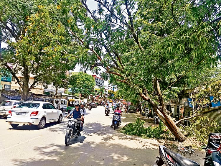 क्लब रोड में तार के सहारे लटका है पेड़