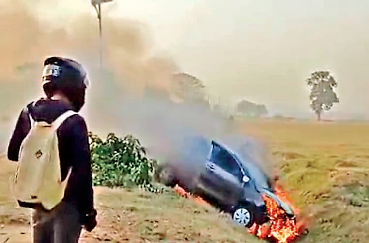 रांची. एयरपोर्ट थाना के पीछे हेथू जाने वाली सड़क पर कार चला रहे सुधांशु सुमन नामक युवक की कार के सामने अचानक एक जानवर आ गया. उस जानवर को बचाने के चक्कर में युवक ने कार से नियंत्रण खो दिया और कार सड़क के किनारे एक गड्ढे में जा गिरी. इसके बाद कार में आग लग गयी. घटना में कार चला रहा युवक घायल भी हो गया. लेकिन कार में आग लगने पर युवक कार से बाहर निकल आया था. इधर, घटना की सूचना मिलते ही पुलिस मौके पर पहुंची और घायल युवक को इलाज के लिए अस्पताल भेजा. वहीं पुलिस ने फायर ब्रिगेड को बुलाकर आग पर काबू पाया. पुलिस के अनुसार कार में आग कैसे लगी, यह जांच का विषय है. पुलिस को आशंका है कि दुर्घटना के कारण किसी तरह शॉट सर्किट की वजह से आग लगी होगी.
