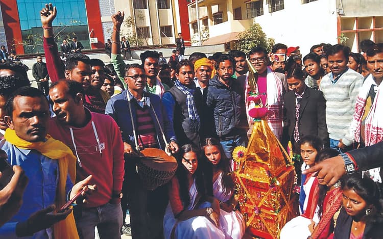 Tusu Festival in Jharkhand: डीएसपीएमयू में बुधवार को टुसू महोत्सव (Tusu Festival) का आयोजन किया गया. कार्यक्रम में विवि के कुलपति डॉ तपन कुमार शांडिल्य, सभी विभागाध्यक्ष, अधिकारी सहित सभी शिक्षकों व विद्यार्थियों ने हिस्सा लिया. मौके पर परंपरा के अनुसार कुंवारी छात्राओं द्वारा टुसू की विधिवत स्थापना कर पूजा-अर्चना की गयी. इसके बाद टुसू माता का विसर्जन किया किया गया. इस मौके पर कुलपति समेत सभी ढोल, नगाड़े की थाप पर टुसू गीत गाते और नाचते नजर आये. अध्यक्षता कुलपति डॉ तपन कुमार शांडिल्य ने की, जबकि आगंतुकों का स्वागत खोरठा विभागाध्यक्ष डॉ विनोद कुमार व धन्यवाद ज्ञापन कुरमाली विभागाध्यक्ष डॉ परमेश्वरी प्रसाद महतो किया. मंच संचालन रूपेश कुमार और अशोक पुराण ने किया.