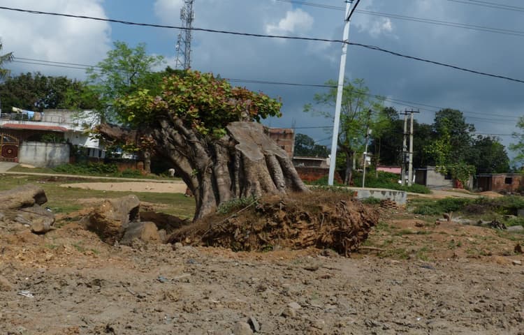 सड़क चौड़ीकरण कार्य के दौरान झुमरी के पास सड़क की बायीं ओर वर्षों पुराने पीपल के पेड़ को उखाड़ दिया गया. इस पेड़ को नियमत: ट्रांसप्लांट करने का निर्देश नहीं था. निर्माण एजेंसी ने पेड़ को उखाड़ कर नीचले हिस्से को सड़क किनारे छोड़ दिया. इस बीच इस पेड़ में कुछ हरे पत्ते निकल आये.