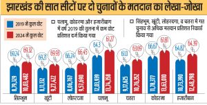 विवेक चंद्र (रांची). राज्य में संपन्न दो चरणों के चुनाव में वर्ष 2019 की तुलना मेंं इस बार वोट बढ़े हैं, लेकिन मतदान का प्रतिशत कम हुआ है. मतदाताओं की संख्या में खासी वृद्धि दर्ज की गयी है. इससे साफ है कि चुनाव में मतदाताओं की भागीदारी लगातार बढ़ी है. झारखंड की बात करें, तो गत चुनाव की तुलना में इस बार सात में से तीन सीटों पर मतदान प्रतिशत में कमी दर्ज की गयी है, लेकिन वह भी मामूली है. इन सीटों पर मतदान प्रतिशत पिछले लोकसभा चुनाव से 0.66% कम दर्ज किया गया है. इन तीन सीटों में पलामू, कोडरमा व हजारीबाग शामिल हैं. जबकि, बाकी की चार सीटों सिंहभूम, खूंटी, लोहरदगा और चतरा में गत चुनाव से अधिक मतदान प्रतिशत रिकार्ड किया गया है. हालांकि, कमी की ही तरह प्रतिशत में वृद्धि भी काफी मामूली है. लेकिन, वोट की संख्या की बात करें, तो हर सीट पर और हर चरण में इसमें वृद्धि दर्ज की गयी है. अब तक संपन्न सात संसदीय सीटों के चुनाव में गत लोकसभा चुनाव की तुलना में 10,80,553 अधिक मतदाताओं ने मतदान किया है.