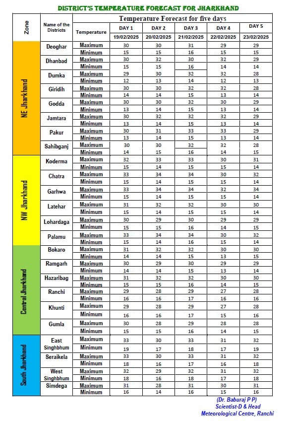 झारखंड के सभी जिलों के अधिकतम और न्यूनतम तापमान