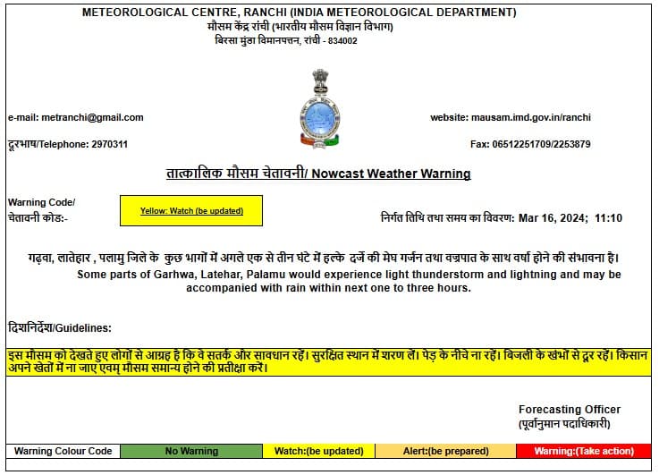 मौसम केंद्र रांची ने जारी किया येलो अलर्ट