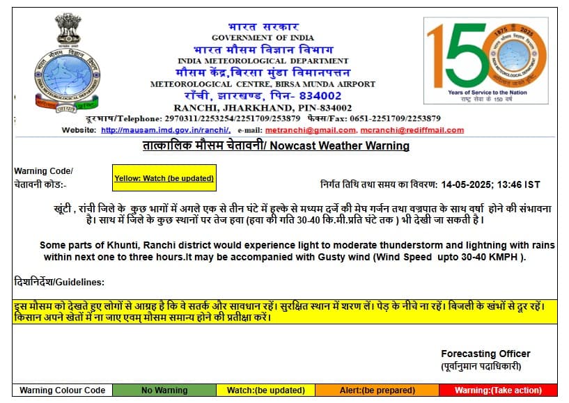 रांची और खूंटी में अगले 3 घंटे में आंधी के साथ वर्षा-वज्रपात का अलर्ट.