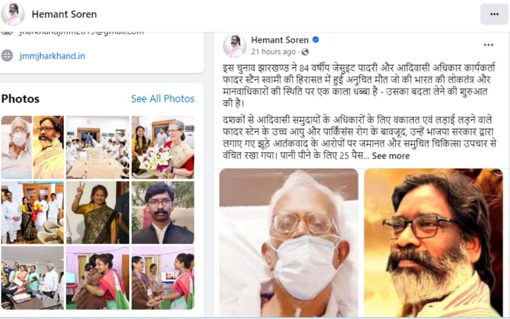 हेमंत सोरेन के फेसबुक अकाउंट से लिखा गया है कि इस चुनाव में झारखंड ने 84 वर्षीय जेसुइट पादरी व आदिवासी अधिकार कार्यकर्ता फादर स्टेन स्वामी की हिरासत में हुई अनुचित मौत का बदला लेने की शुरुआत की है. उनकी मौत भारत के लोकतंत्र व मानवाधिकारों की स्थिति पर एक काला धब्बा है.