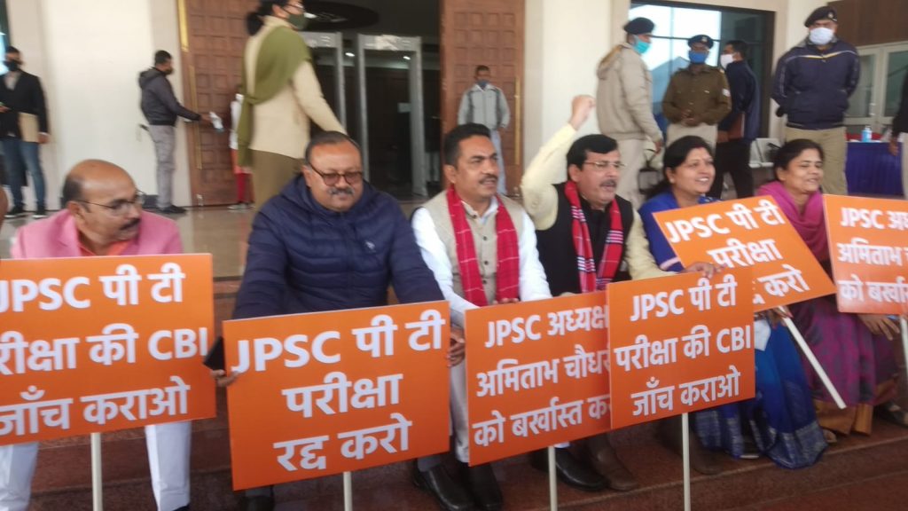 झारखंड विधानसभा में जेपीएससी मुद्दे पर बीजेपी विधायक हंगामा कर रहे हैं. वे जेपीएससी अध्यक्ष को बर्खास्त करने की मांग कर रहे हैं. इससे पहले बीजेपी विधायक धरने पर बैठे थे और सीबीआई जांच की मांग कर रहे थे.