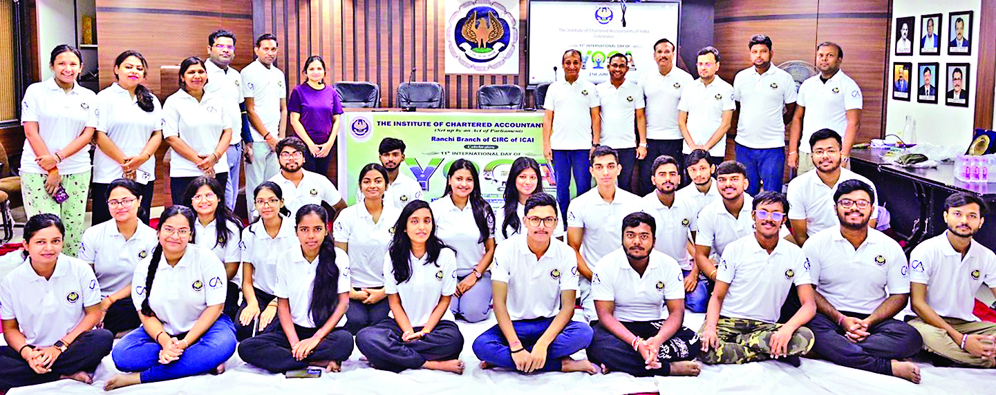 : योग दिवस पर आइसीएआइ का विशेष कार्यक्रम रांची . अंतरराष्ट्रीय योग दिवस के मौके पर द इंस्टीट्यूट ऑफ चार्टर्ड एकाउंटेंट्स ऑफ इंडिया (आइसीएआइ), रांची शाखा ने विशेष कार्यक्रम का आयोजन किया. शाखा अध्यक्ष सीए अभिषेक केडिया ने कहा कि योग केवल व्यायाम नहीं, बल्कि एक जीवनशैली है. कार्यक्रम की शुरुआत लेखन प्रतियोगिता से हुई, विषय संतुलित जीवन के लिए योग था. वहीं, स्लोगन प्रतियोगिता का विषय एक पृथ्वी, एक स्वास्थ्य के लिए योग था. कार्यक्रम का प्रमुख आकर्षण योग प्रशिक्षण शिविर था. संचालन स्वर्णीय योग की संस्थापक शिल्पा जैन ने किया. उन्होंने प्रतिभागियों को योगासन एवं प्राणायाम का प्रशिक्षण दिया. साथ ही नियमित योग करने के फायदे बताये. कार्यक्रम में रांची शाखा के सचिव सीए भुवनेश ठाकुर, सीए हरेंद्र भारती, सीए दिलीप कुमार सहित कई सीए और सीए विद्यार्थी शामिल हुए.