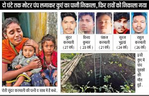 एक जनवरी को लगभग 12 बजे पांचों युवक जश्न मनाकर सुंदर करमाली के आंगन में बैठे थे. इसी दौरान सुंदर करमाली और उसकी पत्नी रूपा देवी के बीच किसी बात को लेकर विवाद हो गया. पत्नी की बात सुंदर करमाली को इतनी नागवार गुजरी कि वह मोटरसाइकिल लेकर घर के आंगन के बगल स्थित कुएं में कूद गया. इस घटना को देखकर उसके साथ बैठे अन्य चार साथी सुंदर करमाली को बचाने के लिए एक-एक कर कुएं में उतरे. काफी देर गुजर जाने के बाद भी सभी जब बाहर नहीं निकले, तो सुंदर करमाली की पत्नी जोर-जोर से चिल्लाने लगी. उसकी आवाज सुनकर आसपास के लोग वहां पहुंच गये. इसके बाद लोगों ने शवों को निकालने के लिए लगभग दो घंटे तक मोटर पंप लगाकर कुएं का पानी निकाला . लगभग दो घंटे बाद पानी जब कम हुआ तो लोगों ने शवों को निकाला.
