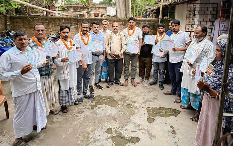 राजमहल प्रखंड क्षेत्र में संगठन सृजन 2025 कार्यक्रम के तहत रविवार को दाहु टोला पंचायत के झुमुर्दी टोला ग्राम में कांग्रेस पार्टी का विस्तार किया गया. कार्यक्रम प्रखंड अध्यक्ष देवेंद्र प्रसाद ठाकुर व राजमहल प्रखंड महासचिव मो सिफरन अख्तर के नेतृत्व में किया गया. इसमें कांग्रेस मंडल अध्यक्ष जुलकर हुसैन भी मौजूद रहे. पंचायत के विभिन्न बूथ और गांव से कांग्रेस कार्यकर्ता उपस्थित हुए. सभी की आपसी सहमति से पंचायत अध्यक्ष, दो उपाध्यक्ष तथा नौ महासचिव का सर्वसम्मति से चुनाव किया गया. इसमें सभी नयी कमेटियों के पदाधिकारियों को कांग्रेस राजमहल प्रखंड महासचिव मो सिफरन अख्तर ने सभी पदाधिकारियों को कांग्रेस पार्टी की विचारधारा को मजबूत करने तथा जनता के हित के लिए किये जाने वाले कार्यों के लिए प्रशिक्षित किया. अख्तर ने बताया कि पार्टी के जिला नेतृत्व के निर्देशानुसार हरेक पंचायत स्तर पर पंचायत अध्यक्ष एवं दो उपाध्यक्ष तथा नौ महासचिव गठन किया जाना है. इससे कांग्रेस पार्टी मजबूत बने. राजमहल प्रखंड अध्यक्ष देवेंद्र प्रसाद ठाकुर, मंडल अध्यक्ष जुलकर हुसैन ने पंचायत और राजमहल प्रखंड महासचिव मो सिफरन अख्तर ने अध्यक्ष और उपाध्यक्ष, सभी पंचायत महासचिवों को नियुक्ति पत्र दिया. अध्यक्ष महताब आलम, उपाध्यक्ष समाउन शेख, दाउद हुसैन, महासचिव सहजुल शेख, मोफाजुल शेख, यूनुस आलम, इनामुल हक, रेजाउल शेख, जेनुल शेख, अमीना खातून, जरीदा बीबी, राहुल शेख को पत्र दिया गया.