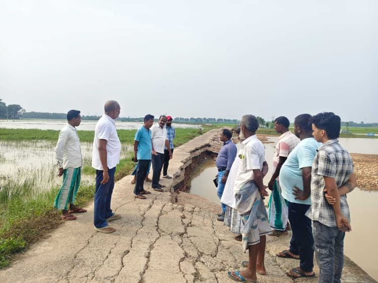बरहरवा. पिछले दिनों गुमानी नदी में उफान के कारण प्रखंड क्षेत्र के दरियापुर से बिनोदपुर जाने वाली पीसीसी सड़क के ऊपर से जल बहाव के कारण सड़क जगह-जगह टूट गयी है. इस वजह से आवागमन बाधित हो गया है. पाकुड़ विधायक निसात आलम के निर्देश पर सोमवार को आरईओ विभाग के जूनियर इंजीनियर मुकेश कुमार एवं कांग्रेस के जिलाध्यक्ष सह विधायक प्रतिनिधि बरकत खान ने स्थल का निरीक्षण किया. बरकत खान ने जल्द ही सड़क की मरम्मत का आश्वासन दिया, मौके पर मोरसलीम खान, हजरत अली, अहादक हुसैन, मोहसिन हुसैन, हबीबुर रहमान, मुबारक, मोफज्जल हुसैन, अंसार अली, छूदु कुनाई, कासिम शेख सहित अन्य मौजूद थे.