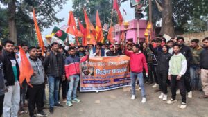 बांग्लादेश में हिंदुओं पर हो रहे अत्याचार व हत्याओं के विरोध में विश्व हिंदू परिषद व बजरंग दल के बैनर तले शुक्रवार की देर शाम पांच बजे आक्रोश प्रदर्शन सह मशाल जुलूस निकाला गया. जुलूस मां तारा मंदिर टॉकीज फील्ड से प्रारंभ होकर कलिंगा होटल, गांधी चौक, विवेकानंद चौक, पटेल चौक, स्टेशन चौक, ग्रीन होटल, कॉलेज रोड एवं चैती दुर्गा रोड होते हुए पूर्वी फाटक पहुंचा. इसके बाद भगत सिंह चौक पर बांग्लादेश सरकार का पुतला दहन किया गया. इस दौरान प्रदर्शनकारी सरकार विरोधी नारे लगा रहे थे. बजरंग दल के करण सिंह यादव ने कहा कि बांग्लादेश सरकार हिंदुओं पर अत्याचार कर रही है. जिलाध्यक्ष करण यादव ने कहा कि बांग्लादेश में हिंदू समाज के विरुद्ध कथित अत्याचार, मंदिरों पर हमले, तोड़फोड़ तथा निर्दोष हिंदू श्रमिक दीपू दास की हत्या अत्यंत निंदनीय है. मशाल जुलूस के दौरान नगर थाना पुलिस मौजूद रही. मौके पर अजय पांडेय, अभिषेक चौरसिया, आदित्य कुमार, आयुष यादव ,सेरा पासवान, अभिषेक यादव, विक्की, सूरज यादव, अमन कुमार, प्रिंस कुमार, अमन कुमार, सुमन यादव, अमित यादव, सोनू यादव, आनंद कुमार, बंटी दास, मिट्ठू कुमार, हलचल यादव समेत दर्जनों कार्यकर्ता शामिल थे. मशाल जुलूस व मार्च में नगर थाने की पुलिस शामिल थी.