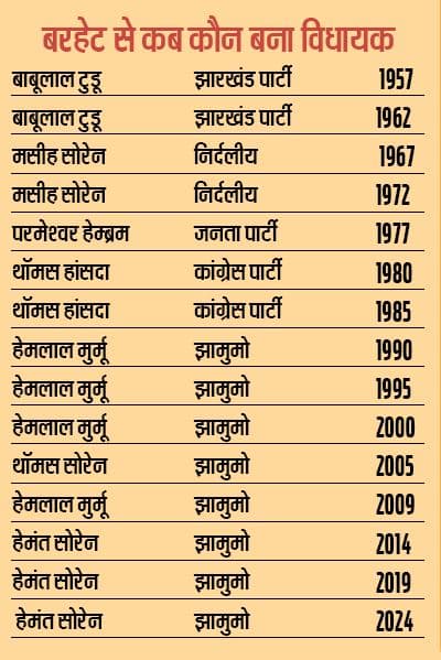 हेमंत सोरेन से पहले बरहेट सीट से हेमलाल मुर्मू ने 1990, 1995 एवं 2000 में जीत कर लगातार हैट्रिक लगायी थी. इस प्रकार बरहेट सीट से हेमंत सोरेन हैट्रिक लगाने वाले दूसरे विधायक बन गये हैं. इस बार 2024 के विधानसभा चुनाव में हेमलाल मुर्मू बरहेट के बगल के लिट्टीपाड़ा विधानसभा से झामुमो के टिकट पर चुनाव जीतकर फिर से विधायक बने हैं.