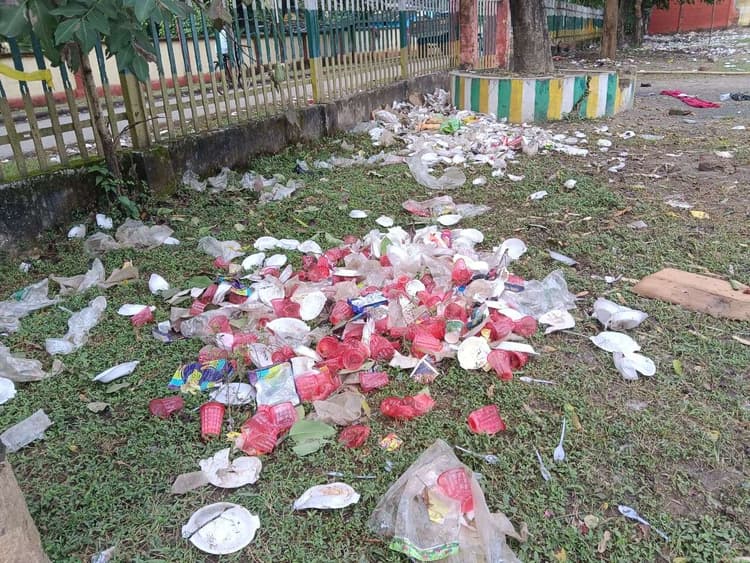 साहिबगंज.रेलवे जेनरल इंस्टीट्यूट में दुर्गा पंडाल लगाने के दौरान लगी दुकानों के आसपास कचरे का अंबार लग गया है. प्रतिमा विसर्जन के बाद भी सफाई नहीं हुई है, जिससे रेलवे मैदान पूरी तरह से गंदगी से भर गया है. यहां रोजाना सैकड़ों महिलाएं और पुरुष योगा करने आते हैं, लेकिन कचरे और बारिश के कारण मैदान गंदा हो गया है. बार-बार लोगों से अपील की गयी कि वे खाने-पीने के बाद बचा हुआ कचरा डस्टबिन में डालें, फिर भी समस्या बनी हुई है. एईएन वेदव्यास ने कहा कि कचरा जल्द ही साफ़ किया जाएगा और इस दिशा में आवश्यक कदम उठाए जाएंगे.