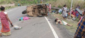 तेज रफ्तार टेंपो पलटा, महिला की मौत, बच्चे समेत 10 घायल