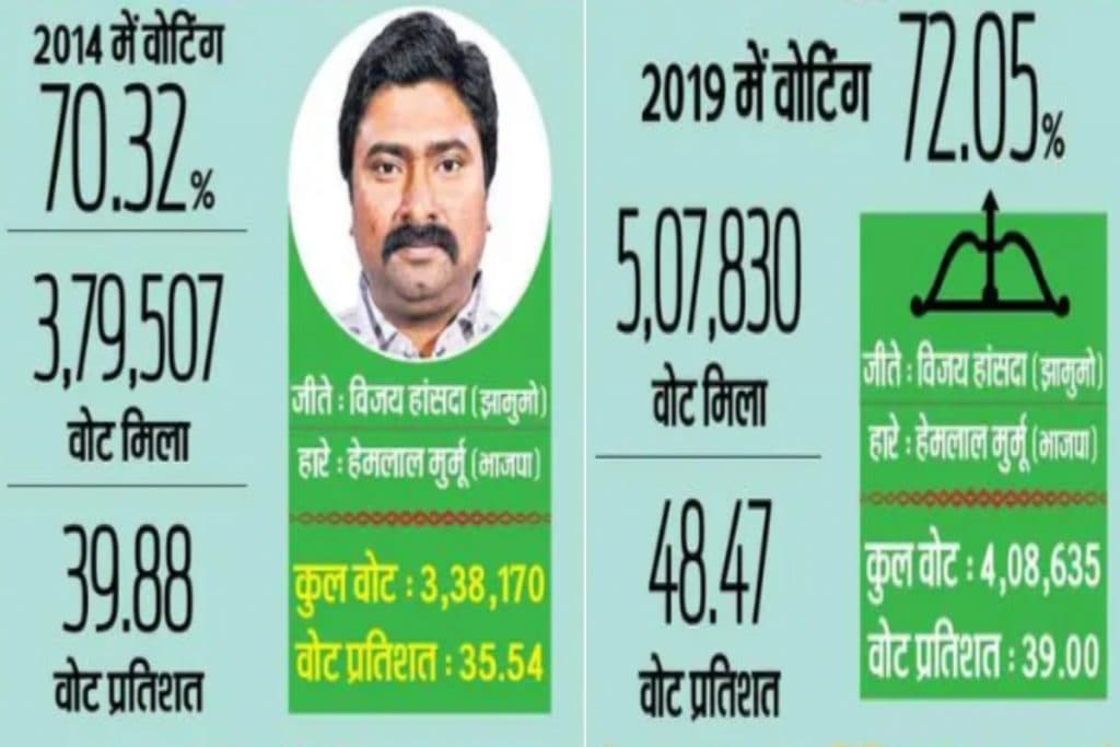 वहीं दूसरे नंबर पर रही भाजपा के हेमलाल मुर्मू को केवल 39 फीसदी वोट यानी 4,08,635 वोट प्राप्त हुए थे. 2014 के चुनाव के मुकाबले झामुमो के वोट में 8.59 प्रतिशत का इजाफा हुआ. जबकि भाजपा के वोट में मात्र 3.46 प्रतिशत की बढ़ोतरी हुई.