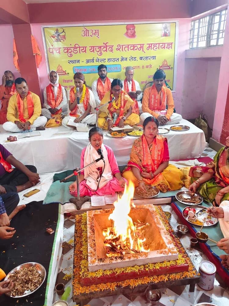 नगर पंचायत क्षेत्र के मेन रोड स्थित आर्य गेस्ट हाउस में रविवार को पंच कुंडीय यजुर्वेद शतकम् महायज्ञ का आयोजन आर्य समाज बरहरवा के द्वारा किया गया. इसमें गुरुकुल की आचार्या तथा 25 ब्रह्मचारिणियों ने सामूहिक रूप से वेद पाठ कर वातावरण को वैदिक मंगलध्वनि से गुंजायमान किया. यज्ञशाला में मुख्य यजमान के रूप में सत्येंद्र आर्य, ललन आर्य, ओम प्रकाश आर्य एवं शत्रुघ्न आर्य मौजूद रहे. कार्यक्रम में विद्वान वक्ताओं के रूप में प्राचार्य काशी बाबू,अंगिरा आर्य एवं अभिनव शास्त्री ने यज्ञ की महत्ता पर अपने विचार व्यक्त किये. वहीं, अपने प्रवचन में विद्वानों ने कहा कि स्वर्ग कामनाओं की पूर्ति यज्ञ से होती है. यज्ञ ही सुख, समृद्धि और भौतिक जीवन का आधार है. इस दौरान विद्वानों ने सभी आर्यजनों से आग्रह किया कि प्रत्येक व्यक्ति को नियमित रूप से यज्ञ करना चाहिये, क्योंकि यह न केवल पर्यावरण की शुद्धि करता है. कार्यक्रम में आयी छोटी-छोटी बच्चियों ने अपने मुख से ओउम् की ध्वनि उत्पन्न कर व धर्म की जय हो, मर्यादा पुरुषोतम रामचंद्र की जय, दयानंद सरस्वती की जय, भारत माता की जय, गोमाता की जय आदि का जयघोष कर कार्यक्रम में ऊर्जा का संचार किया. महायज्ञ के अंत में प्रसाद का भी वितरण किया गया.