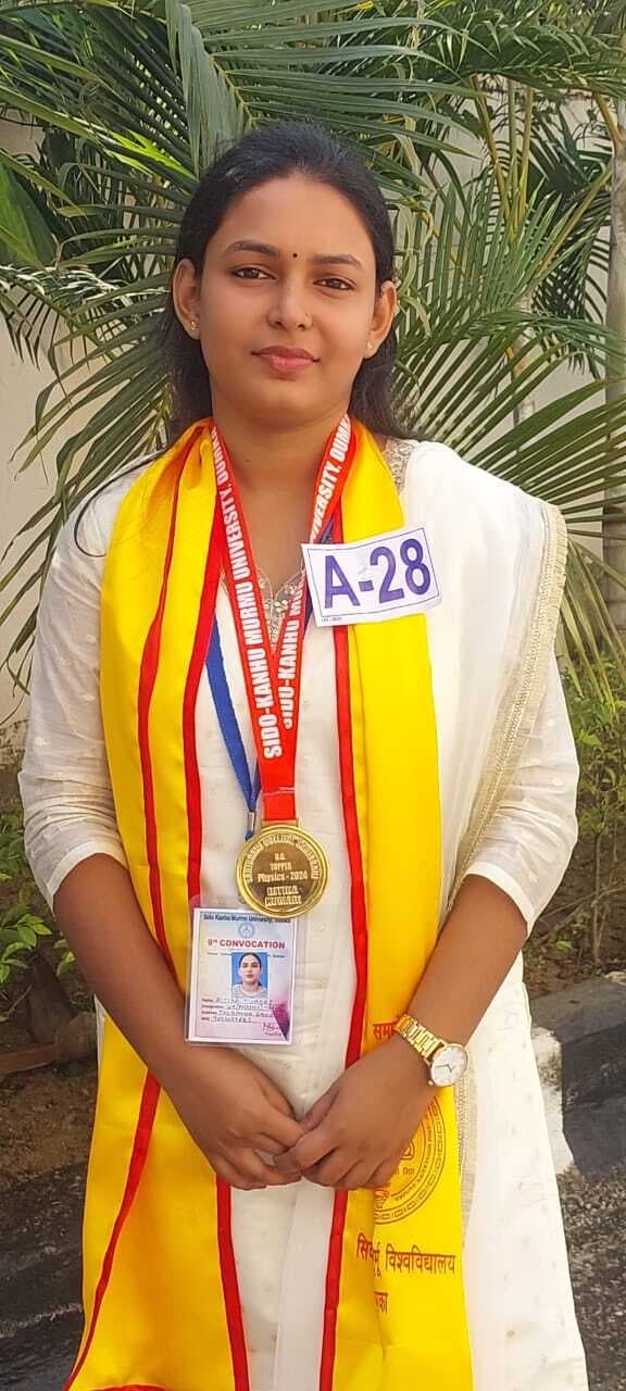 सिदो-कान्हू मुर्मू विश्वविद्यालय में सोमवार को 9वें गोल्ड मेडल दीक्षांत समारोह साहिबगंज कॉलेज साहिबगंज के भू विज्ञान स्नातकोत्तर की छात्रा अनीता मुर्मू ने सर्वोच्च अंक लाकर गोल्ड मेडल प्राप्त किया. उन्होंने अपने सत्र में सर्वोत्तम अंक प्राप्त किये हैं. अनीता मुर्मू को राज्यपाल सह कुलाधिपति झारखंड व विश्वविद्यालय की कुलपति ने संयुक्त रूप से उत्कृष्ट प्रदर्शन के लिए स्वर्ण पदक हासिल किया. वहीं भू विज्ञान विभाग के अध्यक्ष अआरआई रिजवी और शिक्षक भू विज्ञान डॉ रणजीत कुमार सिंह ने अनीता को बधाई दी. साथ ही डॉ रणजीत ने कहा अनीता साहिबगंज कॉलेज का नाम रौशन किया. छात्रों के लिए दीक्षांत समारोह एक उत्सव से कम नहीं है, जिसमें सालों भर मेहनत लगन निरंतरता अनुशासन अभ्यास समय प्रबंधन का परिणाम परीक्षा फल में मिलता है. साहिबगंज कॉलेज की भौतिकी विज्ञान की को स्नातक में स्वर्ण पदक राज्यपाल व कुलपति के हाथों प्राप्त किया. कॉलेज के प्राचार्य और शिक्षकों ने बधाई दिया है और शोध के लिए शुभकामनाएं दीं. वहीं दूसरी ओर साहिबगंज कॉलेज की ऋतिका कुमारी भौतिकी विज्ञान को स्नातक विज्ञान में स्वर्ण पदक प्राप्त किया.