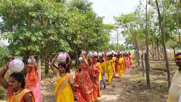 राजमहल/मंगलहाट. राजमहल प्रखंड क्षेत्र के संग्रामपुर गांव में पोइला वैशाख पर सार्वजनिक संग्रामपुर के संकटमोचन हनुमान मंदिर में प्रतिमा की प्राण प्रतिष्ठा को लेकर 501 कन्याओं ने कलश यात्रा निकाली. इससे पहले मंदिर ग्रामीण कमेटी की ओर से शामिल हुए मुख्य अतिथि लालमाटी पंचायत के मुखिया बबिता देवी, नंदकिशोर यादव, कन्हाई प्रसाद यादव, मिथिलेश मिश्रा, छोटू कुमार यादव, राधेश्याम यादव, मुकेश यादव, प्रदीप यादव, रोशन शर्मा को अंग वस्त्र देकर स्वागत किया गया और कलश शोभा यात्रा निकाली गयी. कन्याएं एवं महिलाओं ने मंगलहाट उत्तरवाहिनी गंगा नदी से जल लाकर मंदिर की परिक्रमा कर पुरोहित रामजीवन झा के द्वारा प्राण प्रतिष्ठा कर हनुमान की प्रतिमा स्थापित की गयी. ग्रामीण नंदकिशोर यादव ने बताया कि दो दिवसीय हरिनाम संकीर्तन का भी आयोजन होगा.