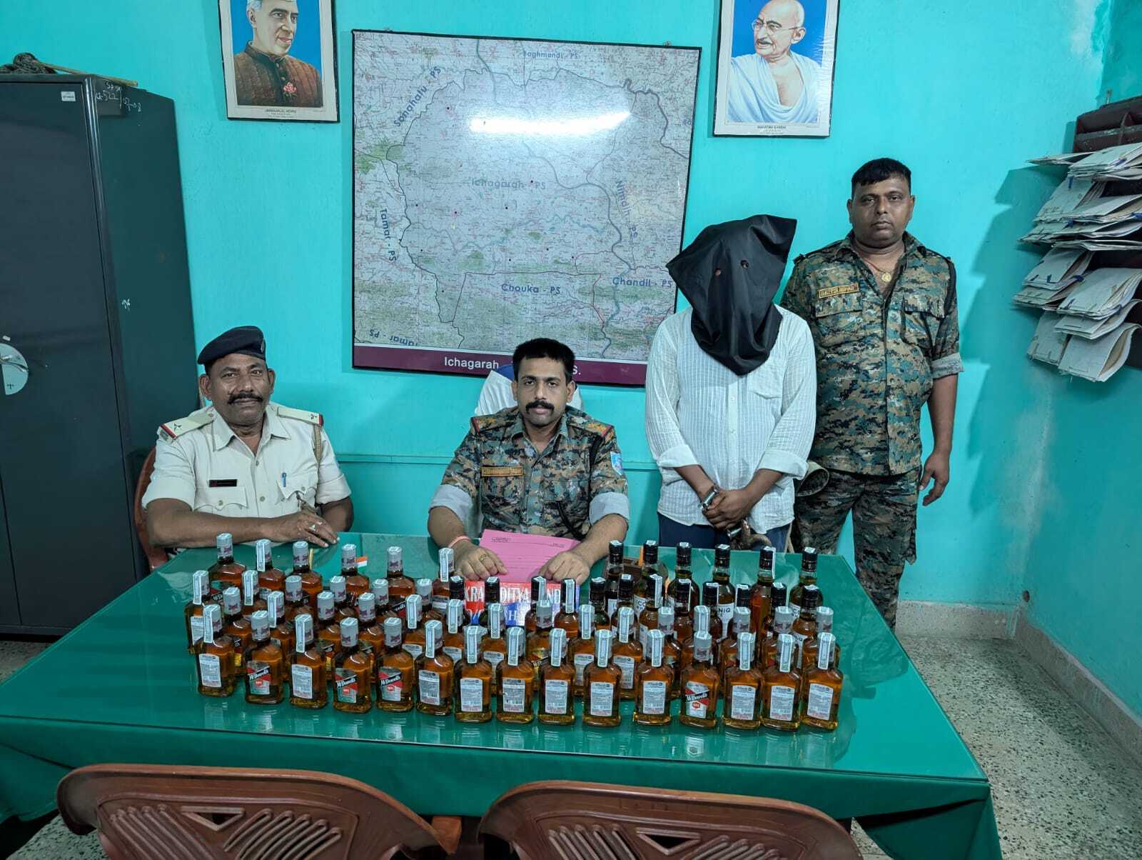 चौका. ईचागढ़ पुलिस ने शराब तस्करी के आरोप में रांची के सिल्ली थाना अंतर्गत अजयगढ़ निवासी बुधराम माहली को गिरफ्तार कर जेल भेज दिया. थाना प्रभारी विक्रमादित्य पांडेय ने बताया कि बीते शनिवार को एसपी को सूचना मिली कि रांगामाटी सिल्ली सड़क मार्ग पर शराब की अवैध तस्करी की जा रही है. छापेमारी दल का गठन रुगड़ी बाजार के समीप एंटी क्राइम चेकिंग लगाया गया. चेकिंग के दौरान स्कूटी सवार व्यक्ति पुलिस को देखकर भागने लगा. पुलिस ने उक्त व्यक्ति को दौड़ा कर पकड़ा. स्कूटी की तलाशी के दौरान मेकडॉवेल कंपनी का 180 एमएल का 12 बोतल अंग्रेजी शराब, 375 एमएल का 6 बोतल अंग्रेजी शराब, आइकोनिक व्हाइट कंपनी का 180 एमएल का 12 बोतल अंग्रेजी शराब, 375 एमएल का 6 बोतल अंग्रेजी शराब तथा मेकडॉवेल कंपनी का 180 एमएल का कुल 24 बोतल अंग्रेजी शराब बरामद किया गया. स्कूटी (जेएच-01 एफए-1694) को जब्त किया गया है.