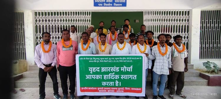 खरसावां.खरसावां के पीडब्लूडी गेस्ट हाउस में स्थानीय लोगों ने बैठक कर वृहद् झारखंड मोर्चा के नाम से एक गैर राजनीतिक दल का गठन किया. गुनाराम जामुदा की अध्यक्षता में बैठक में संगठन को सुचारू रूप से चलाने के लिए अध्यक्ष, महासचिव व कार्यकारिणी सदस्यों का चयन सर्वसम्मति से किया गया. इसमें खरसावां विधानसभा के पूर्व प्रत्याशी बिरसा सोय को अध्यक्ष, भरत सिंह गागराई को महासचिव चुना गया. वहीं गुनाराम सावैयां, दुर्गा सावैयां, अभय सिंह जामुदा, सावन बारला, अविनाश जामुदा, रायसिंह जामुदा, गोंडो पूर्ति को कार्यकारिणी सदस्य चुना गया. कमेटी का विस्तार संगठन के अध्यक्ष, महासचिव एवं कार्यकारिणी सदस्य अपने सुविधानुसार करेंगे. इस दौरान वृहद् झारखंड मोर्चा के पदाधिकारी एवं कार्यकारिणी सदस्यों को फूल माला पहना कर स्वागत किया गया.