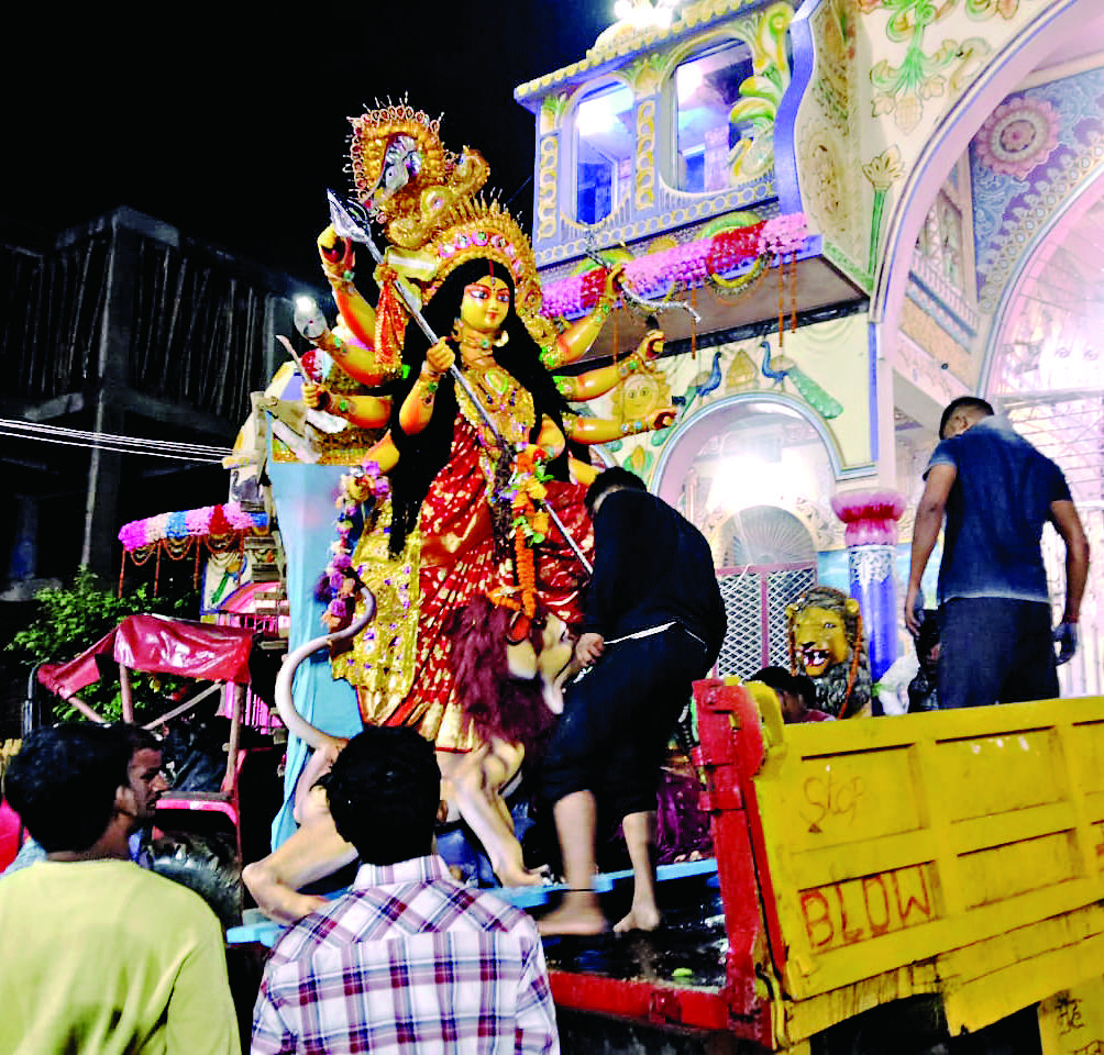 दशहरा के समापन पर शुक्रवार को राजनगर स्थित राजा तालाब में मां दुर्गा की प्रतिमाओं का विसर्जन नम आंखों से हुआ. पंडालों में सिंदूर खेला के बाद महिलाओं ने मां को विदाई दी. इलाके में जय माता दी और जय दुर्गा के जयकारे लगे.विसर्जन जुलूस में सैकड़ों की संख्या में श्रद्धालु शामिल हुए. पूजा कमेटी के अध्यक्ष दिलीप राउत ने कहा कि मां दुर्गा भक्तों की मनोकामना पूरी करती हैं.