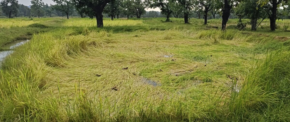 तेज हवा के साथ हुई बारिश के कारण कुछ खेतों में रोपी गयी धान की फसल गिर गयी है. धान की बालियां पूरी तरह निकल चुकी थीं, जिससे फसल को बड़ा नुकसान हुआ है. किसानों ने बताया कि अधिक बारिश से धान की खेती प्रभावित हुई है और भविष्य में भी बारिश जारी रहने से पैदावार पर नकारात्मक प्रभाव पड़ेगा.खेतों में जलजमाव से सब्जियों को नुकसान