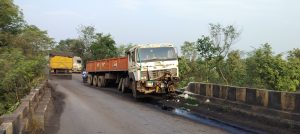 तेज रफ्तार ट्रेलर पुलिया के गार्डवाल से टकराया, एक घंटा आवागमन बाधित