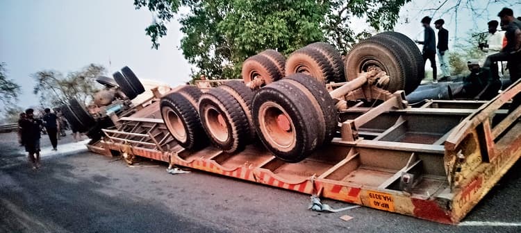 पाइप बांधने वाली चेन टूटी, ट्रेलर पलटा