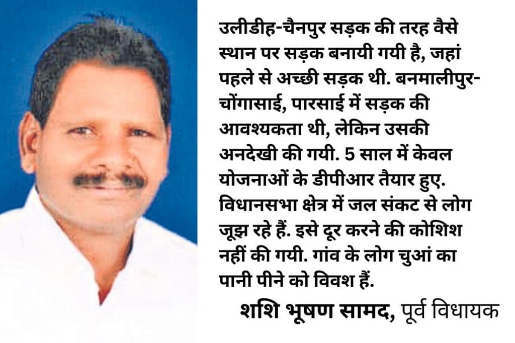 2019 के चुनाव में दूसरे स्थान पर रहे लक्ष्मण गिलुवा का देहांत हो चुका है. तीसरे स्थान पर पूर्व विधायक शशि भूषण सामद थे. उनका मानना है कि चक्रधरपुर में विकास का कोई कार्य नहीं हुआ है. केवल ठेकेदारी को प्राथमिकता दी गयी है. उलीडीह-चैनपुर सड़क की तरह वैसे स्थान पर सड़क बनायी गयी है, जहां पहले से अच्छी सड़क थी. बनमालीपुर-चोंगासाई, पारसाई में सड़क की आवश्यकता थी, लेकिन ऐसी सड़कों की अनदेखी की गयी. पांच साल में केवल योजनाओं की डीपीआर तैयार की गयी. योजनाएं धरातल पर नहीं उतरीं. इस विधानसभा क्षेत्र में जल संकट से लोग जूझ रहे हैं. मगर जल संकट की समस्या दूर करने की कोशिश नहीं की गयी. गांव के लोग चुआं का पानी पीने को विवश हैं.