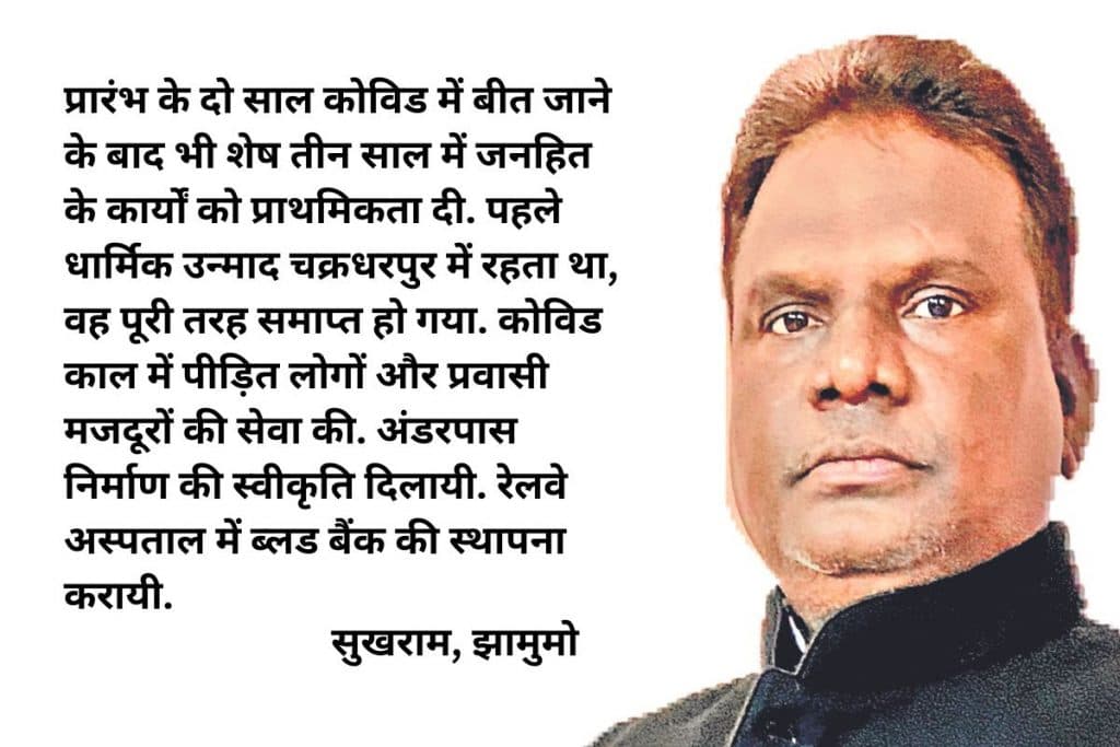 विधायक सुखराम उरांव अपने पांच साल के कार्यकाल से संतुष्ट हैं. वह कहते हैं प्रारंभ के दो साल कोविड में बीत जाने के बाद भी शेष तीन साल में जनहित के कार्यों को प्राथमिकता दी. पहले धार्मिक उन्माद चक्रधरपुर में रहता था, वह पूरी तरह समाप्त हो गया. कोविड काल में पीड़ित लोगों और प्रवासी मजदूरों की सेवा की. अंडरपास निर्माण की स्वीकृति दिलायी. रेलवे अस्पताल में ब्लड बैंक की स्थापना करायी. चक्रधरपुर को जिला, टोकलो व कराईकेला को प्रखंड बनाने की मांग बार- बार विधानसभा में उठायी. बिजली संकट से लोगों को निजात दिलायी. आधा दर्जन से अधिक एम्बुलेंस सेवा बहाल की. बिरसा भगवान मुंडा की प्रतिमाएं 25 स्थानों पर स्थापित करवायी. जनता की समस्याओं को प्राथमिकता के आधार पर निदान करवाया.