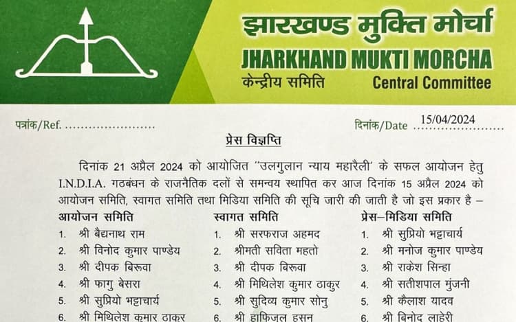 झारखंड की राजधानी रांची में 21 अप्रैल को होने वाली ‘उलगुलान न्याय महारैली’ के सफल आयोजन के लिए केंद्र की नरेंद्र मोदी सरकार विरोधी विपक्षी गठबंधन I.N.D.I.A. के घटक दलों से समन्वय बनाते हुए कई समितियों का गठन किया. इसमें 60 सदस्य बनाए गए हैं.
