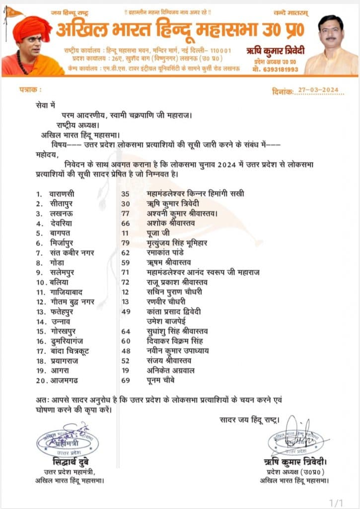 अखिल भारत हिंदू महासभा ने यूपी में उतारे 20 प्रत्याशी