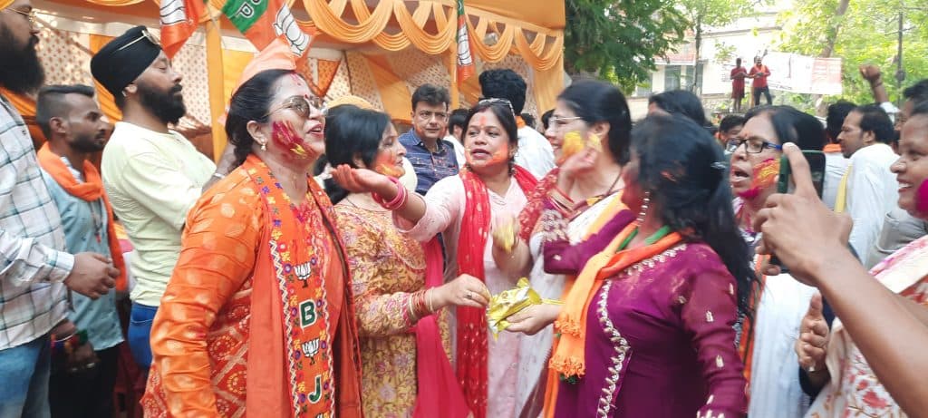 मतगणना केंद्र के बाहर जश्न मनाते दिखे भाजपा कार्यकर्ता,जम कर खेले होली