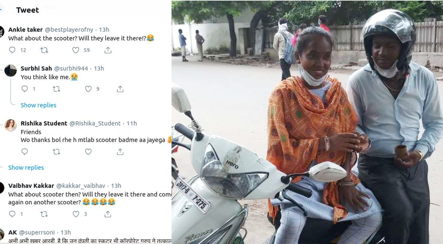 इस ट्वीट पर रिषिका, जो खुद को स्टूडेंट बताती हैं, ने उन्हें समझाया. लिखा, ‘दोस्तों, वे धन्यवाद बोल रहे हैं. मतलब स्कूटर बाद में आ जायेगा.’ एक व्यक्ति ने लिखा, ‘सिर्फ मैं ही ऐसा सोच रहा हूं या सभी लोग स्कूटर के बारे में ही सोच रहे हैं.’ इससे पहले एक व्यक्ति ने जानकारी दी, ‘अभी-अभी खबर आ रही है कि उस दंपती का स्कूटर भी कॉर्पोरेट ग्रुप ने तत्काल ट्रांसपोर्ट करवा दिया है.’
