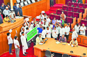 विधानसभा का सत्र सुबह 10:30 बजे प्रश्नकाल से शुरू हुआ. बड़साही विधायक सनातन बिजुली के प्रश्न का उत्तर देने के लिए मंत्री पृथ्वीराज हरिचंदन वक्तव्य पढ़ना शुरू ही किये थे कि बीजद विधायक हंगामा करते हुए अध्यक्ष की अपील को अनसुना कर बार-बार सदन के बीच आकर नारेबाजी करने लगे. उल्लेखनीय है कि शुक्रवार और शनिवार को बीजद विधायकों ने किसानों की समस्या और खाद संकट को लेकर हंगामा किया था, जिससे सदन में कोई कामकाज नहीं हो पाया था. सोमवार को उन्होंने पंचायतीराज व्यवस्था में जनप्रतिनिधियों की शक्तियों को कम करने और नौकरशाही को अधिक अधिकार देने के खिलाफ नारेबाजी की. बीजद विधायकों ने बैनर और तख्तियां लेकर सरकार पर पंचायतीराज व्यवस्था को कमजोर करने का आरोप लगाया और कहा कि इसे किसी भी हालत में बर्दाश्त नहीं किया जायेगा.