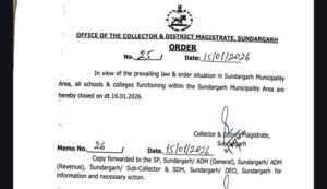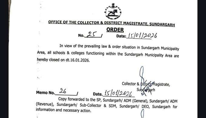 सुंदरगढ़ जिले में उपजी कानून-व्यवस्था की स्थिति को ध्यान में रखते हुए जिलापाल डॉ शुभंकर महापात्र ने सुंदरगढ़ नगरपालिका क्षेत्र में सभी स्कूलों और कॉलेजों को बंद करने का निर्देश दिया है. इस निर्देश के आलोक में शुक्रवार (16 जनवरी 2026) को सभी शैक्षणिक संस्थान बंद रहेंगे. इस संबंध में एक पत्र एसपी, एडीएम समेत विभिन्न प्रशासनिक अधिकारियों को जारी किया गया है.डिस्क्लेमर: यह प्रभात खबर समाचार पत्र की ऑटोमेटेड न्यूज फीड है. इसे प्रभात खबर डॉट कॉम की टीम ने संपादित नहीं किया है