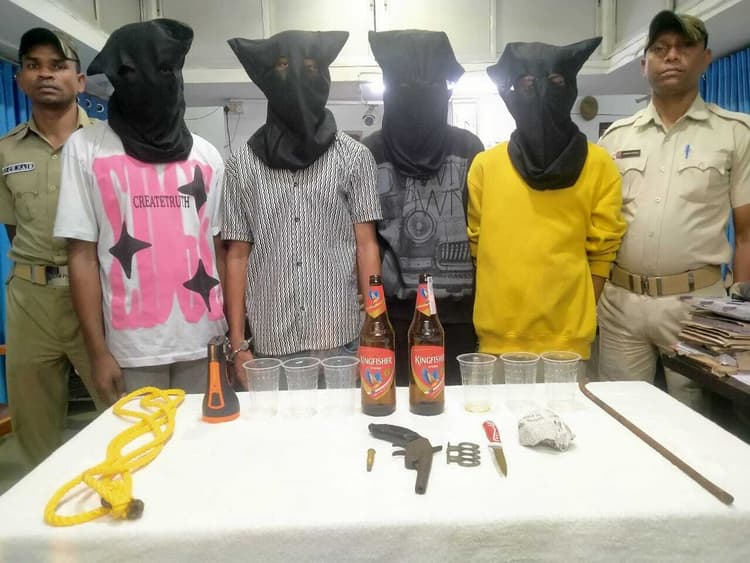 Rourkela News: उदितनगर पुलिस टीम ने रविवार की रात बिरसा डाहर अंचल में डकैती की योजना काे विफल कर दिया है. इस मामले में चार डकैत को गिरफ्तार किया गया है. उनके पास से घातक हथियार समेत अन्य सामान बरामद किये गये हैं. लेकिन दो डकैत फरार होने में सफल रहे. जिनकी तलाश जारी है. जानकारी के अनुसार, उदितनगर पुलिस की टीम रविवार की रात जब आरएमसी चौक पर थी. तभी विश्वसनीय सूत्रों से सूचना मिली कि कुछ युवक म्युनिसिपल कॉलेज मैदान के पीछे एक सुनसान जगह पर एक-दूसरे से गपशप कर रहे है. रात के समय सड़क पर चलने वाले लोगों या इलाके के किसी भी घर/दुकान में डकैती या लूटपाट की आशंका है. रात करीब 2:45 बजे पुलिस टीम ने कुछ लोगों को म्यूनिसिपल कॉलेज के पीछे की तरफ घूमते देखा. पुलिस मौके से चार संदिग्धों को पकड़ने में सफल रही, जबकि दो भागने में सफल रहे. पकड़े गये लोगों से जब रात के के समय सुनसान जगह पर इकट्ठा होने का कारण पूछा गया, तो सभी असमंजस में दिखे और संतोषजनक जवाब नहीं दे सके. आगे पूछताछ करने पर उन्होंने कबूल किया कि वे कट्टा, पिस्तौल, जिंदा कारतूस, चाकू, लोहे की छड़ें जैसे घातक हथियार लेकर वहां एकत्र हुए थे. रॉड, रस्सी, मिर्च पाउडर, नकल पंच (फाइबर) आदि के साथ सभी पास के बिसरा डाहर रोड से डकैती करने के लिए जा रहे थे.