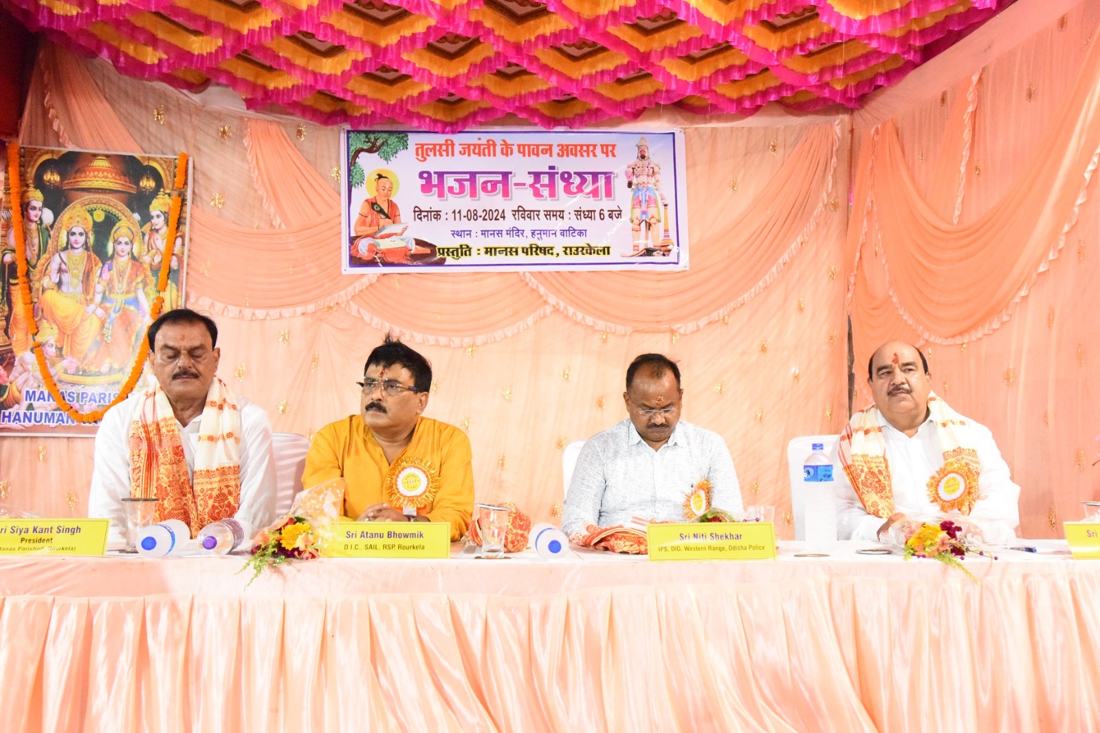 राउरकेला. हनुमान वाटिका परिसर में मानस परिषद् के द्वारा आयोजित गोस्वामी तुलसीदास की जयंती एवं भजन संध्या का कार्यक्रम संपन्न हो गया. समारोह में मुख्य अतिथि राउरकेला इस्पात संयंत्र के निदेशक प्रभारी अतनु भौमिक एवं सम्मानित अतिथि डीआइजी नीति शेखर थे. श्रीरामचरित मानस के रचयिता गोस्वामी तुलसीदास के जन्मदिवस पर हर साल यह समारोह मनाया जाता है तथा संक्षेप में उनकी जीवनी व लेखनी पर चर्चा होती है. कार्यक्रम का शुभारंभ मानस मंदिर में राम व सीता के पूजा अर्चना के साथ हुआ. संस्था के अध्यक्ष सियाकांत सिंह ने मुख्य अतिथि एवं सचिव राजकुमार शुक्ला ने सम्मानित अतिथि का शॉल ओढ़ाकर स्वागत किया. मुख्य अतिथि अतनु भौमिक ने कहा कि उनका बचपन राउरकेला में व्यतीत हुआ है. संस्था के साथ राउरकेला संयंत्र का लंबा जुड़ाव रहा है. उन्होंने विजयदशमी के दिन नेहरू मैदान में होने वाले रावण दहन की यादें ताजा की जो कार्यक्रम पूर्व में परिषद् द्वारा वर्षों तक आयोजित होता रहा था.