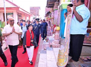 सिंगापुर के राष्ट्रपति षणमुगरत्नम बाद में कोणार्क में 13वीं सदी के सूर्य मंदिर पहुंचे, जहां राज्य सरकार और भारतीय पुरातत्व सर्वेक्षण (एएसआइ) के अधिकारियों ने उनका स्वागत किया. एक अधिकारी ने कहा कि सिंगापुर के राष्ट्रपति की यात्रा के मद्देनजर, अन्य पर्यटकों को अपराह्न 12 बजे तक मंदिर में जाने की अनुमति नहीं दी गयी. षणमुगरत्नम की यात्रा के लिए पूरे जिले में सुरक्षा कड़ी कर दी गयी है. कोणार्क की यात्रा के दौरान सिंगापुर के राष्ट्रपति को हर चीज समझाने वाले गाइड आभास मोहंती ने कहा कि हमने उन्हें दुनिया की विभिन्न सभ्यताओं में लोगों की जीवनशैली और मंदिर में पत्थर के काम में वर्णित मानवीय भावनाओं के बारे में बताया. हमने उन्हें कोणार्क मंदिर में पत्थर की मूर्तियों के आकार से भी अवगत कराया. वे वास्तव में बहुत खुश हुए.कलाभूमि में ओडिशा की कला, हस्तशिल्प और हथकरघा को देखा