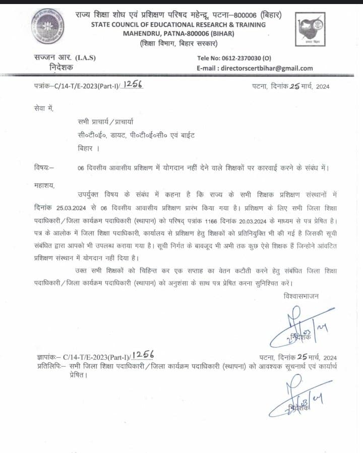 SCERT निदेशक सज्जन आर. के हस्ताक्षर से सभी प्रशिक्षण केंद्रों के प्राचार्यों को जारी पत्र में कहा गया है कि राज्य के सभी शिक्षक प्रशिक्षण संस्थानों में 25 मार्च से छह दिवसीय आवासीय प्रशिक्षण शुरू किया गया है. प्रशिक्षण के संबंध में सभी जिला शिक्षा पदाधिकारी एवं जिला कार्यक्रम पदाधिकारी (स्थापना) को 20 मार्च को ही पत्र के माध्यम से सूचित कर दिया गया था. जिसके बाद जिला शिक्षा पदाधिकारी द्वारा शिक्षकों को प्रशिक्षण के लिए प्रतिनियुक्त भी कर दिया गया है. लेकिन इसके बाद भी कई शिक्षक ऐसे हैं जिन्होंने आवंटित प्रशिक्षण संस्थान में योगदान नहीं दिया है. ऐसे सभी शिक्षकों के एक सप्ताह के वेतन काटे जाने की कार्रवाई की जाएगी.