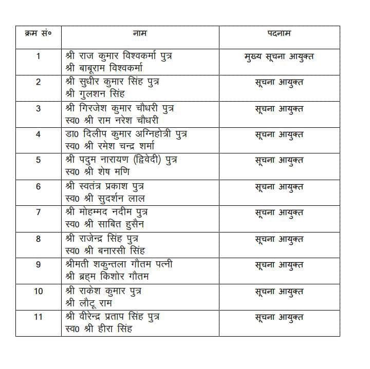 मुख्यमंत्री योगी आदित्यनाथ की अध्यक्षता में गठित चयन समिति की सिफारिश पर राज्यपाल आनंदी बेन पटेल ने गुरुवार को उत्तर प्रदेश सूचना आयोग के लिए मुख्य सूचना आयुक्त और 10 सूचना आयुक्तों की नियुक्ति की है. पूर्व आईपीएस राजकुमार विश्वकर्मा यूपी पुलिस भर्ती एवं प्रोन्नति बोर्ड के अध्यक्ष के साथ ही विभिन्न जनपदों में वरिष्ठ पुलिस अधिकारी के रूप में अपनी सेवाएं दे चुके हैं. इनके अलावा सुधीर कुमार सिंह और गिरजेश कुमार चौधरी भी सेवानिवृत्त पुलिस अधिकारी हैं. डॉ. दिलीप कुमार अग्निहोत्री एसोसिएट प्रोफेसर, मो. नदीम, राजेंद्र सिंह, पद्म नारायण द्विवेदी, स्वतंत्र प्रकाश, वीरेंद्र प्रताप सिंह वरिष्ठ पत्रकार हैं. शकुंतला गौतम सेवानिवृत्त आईएएस अधिकारी, राकेश कुमार पूर्व न्यायिक अधिकारी को प्रदेश का सूचना आयुक्त नियुक्त किया गया है.