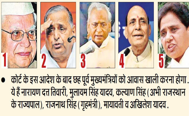 कोर्ट के इस आदेश के बाद छह पूर्व मुख्यमंत्रियों को आवास खाली करना होगा. ये हैं नारायण दत्त तिवारी, मुलायम सिंह यादव, कल्याण सिंह (अभी राजस्थान के राज्यपाल), राजनाथ सिंह (गृहमंत्री), मायावती व अखिलेश यादव.