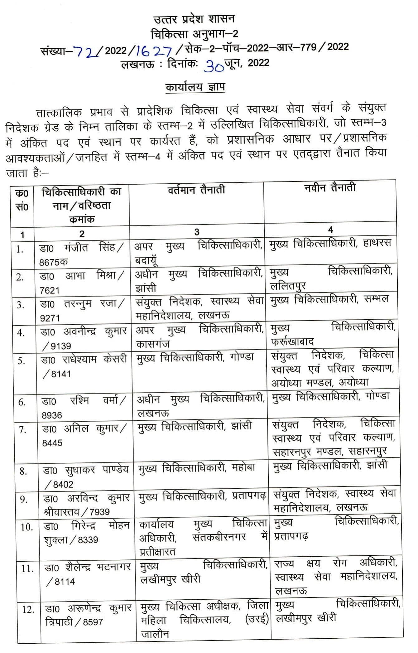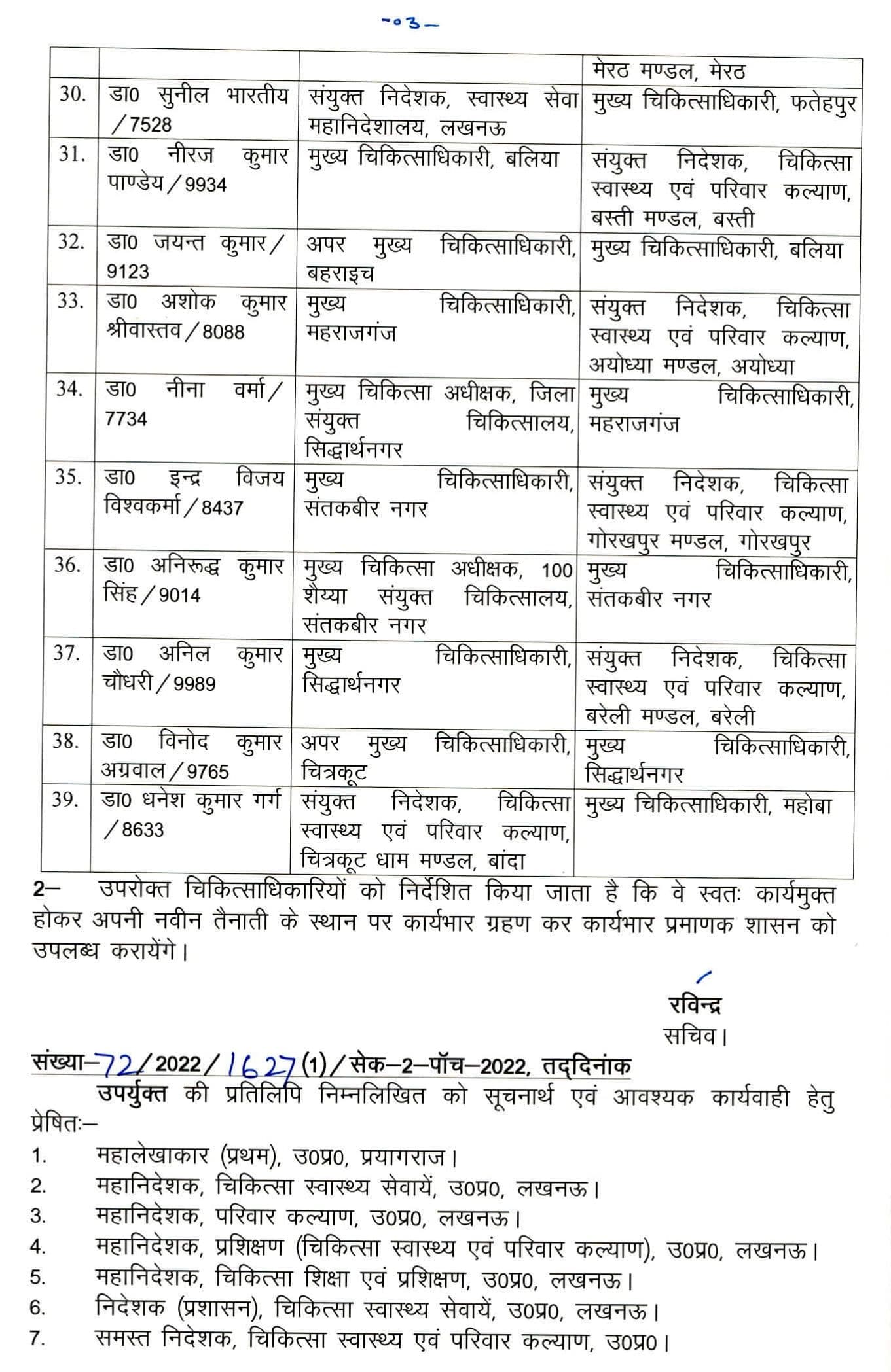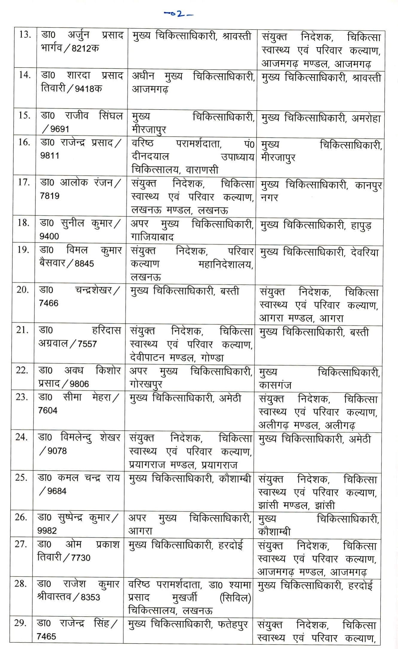 तबादले के आदेश में जिन संयुक्त निदेशकों के नाम शामिल हैं, उनमें डॉ. राधेश्याम केसरी को अयोध्या मंडल, डॉ. अनिल कुमार को सहारनपुर मंडल, डॉ. अरविंद कुमार श्रीवास्तव को स्वास्थ्य महानिदेशालय, डॉ. अर्जुन प्रसाद भार्गव को आजमगढ़ मंडल, डॉ. चंद्रशेखर को आगरा मंडल, डॉ. सीमा को मेहरा अलीगढ़ मंडल, डॉ. कमल चंद्र राय को झांसी मंडल, डॉ. ओम प्रकाश तिवारी को आजमगढ़ मंडल, डॉ. राजेंद्र सिंह को मेरठ मंडल, डॉ. नीरज कुमार पाण्डेय को बस्ती मंडल, डॉ. अशोक कुमार श्रीवास्तव को अयोध्या मंडल, डॉ. इंद्र विजय विश्वकर्मा को गोरखपुर मंडल और डॉ. अनिल कुमार चौधरी को बरेली मंडल में स्थानांतरित किया गया है.
