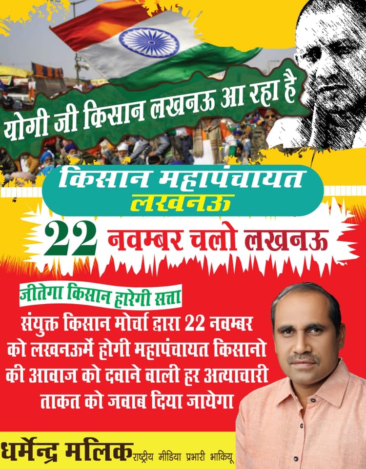 पोस्टर में जानकारी दी गई है कि संयुक्त किसान मोर्चा की ओर से 22 नवंबर को उत्तर प्रदेश की राजधानी लखनऊ में महापंचायत का आयोजन किया जाएगा. उन्होंने दावा किया है कि वे किसानों की आवाज़ दबाने वाली हर अत्याचारी ताकत को जवाब देने के लिए लखनऊ आ रहे हैं. बता दें कि बीते 15 नवंबर को देश में लागू किये गए तीन कृषि कानूनों के विरोध में प्रदर्शन करते हुए किसानों को एक साल पूरे हो गए हैं. इसी के विरोध में यूपी के मुख्यमंत्री योगी आदित्यनाथ के नाम से यह पोस्टर जारी किया गया है.