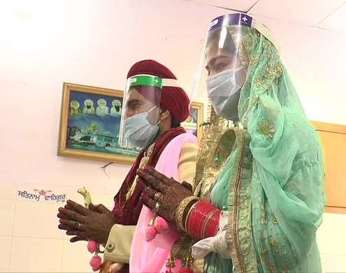 A couple tied the knot wearing masks and face shields at a Gurudwara in Kanpur yesterday, in view of #COVID19 pandemic. As per the guidelines of Ministry of Home Affairs (MHA), gathering of not more than 50 persons is allowed at wedding functions. pic.twitter.com/CnmJUQ1xEH
