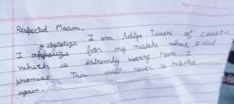 छात्र के पास से बरामद माफीनामा में उसने लिखा है कि मैम, मैं… कक्षा नौ का छात्र हूं. मैं माफी मांगता हूं, जो कुछ भी गलती मैंने की. मैंने जो किया वह बहुत गलत था. मैम, मैं वादा करता हूं कि ऐसा दोबारा कभी नहीं होगा.