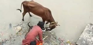 मामला कानपुर के सरसैया घाट का है. सरसैया घाट पर मालिक के साथ आए पिटबुल डॉग ने अचानक ही एक गाय पर हमला बोल दिया. वीडियो में साफ देखा जा सकता है कि गाय कुछ खाने के लिए जमीन पर झुकी है. गाय के जबड़े को पिटबुल ने अपने दांतों से दबोच लिया. अचानक हुए हमले से गाय ने खुद को छुड़ाने की कोशिश की और पीछे की ओर भागी लेकिन उसकी कोशिश विफल रही. इसी बीच पिटबुल के मालिक ने भी गाय के जबड़े को कुत्ते के दांतों से छुड़ाने के लिए उसकी पिटाई शुरू कर दी. हाथों से ताबड़तोड़ पिटाई के बाद भी जब पिटबुल ने गाय के जबड़े को नहीं छोड़ा तो आस-पास के लोग भी मदद के लिए आगे आ गए.