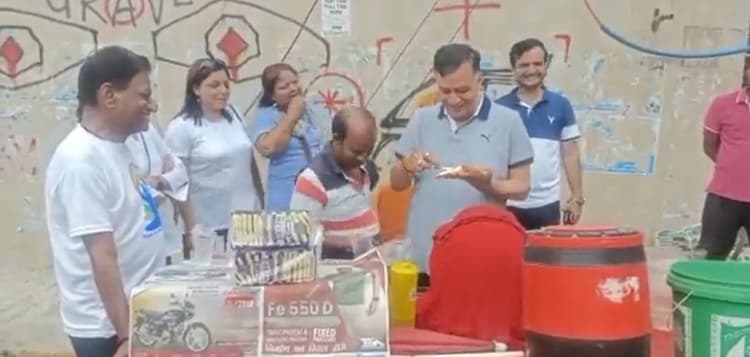 उत्तर प्रदेश में विधानसभा अध्यक्ष सतीश महाना मंगलवार को योग दिवस के मौके पर कानपुर में थे. यहां वह एक अलग ही अंदाज में दिखे. योग दिवस कार्यक्रम से निकलने के बाद उन्हें सड़क किनारे ब्रेड मक्खन खाते हुए देखा गया. उन्होंने ग्रीनपार्क स्टेडियम में आयोजित योग उत्सव कार्यक्रम में हिस्सा लिया था. ग्रीनपार्क स्टेडियम में योग उत्सव के मौके पर आज 4000 लोगों ने योग अभ्यास किया. स्टेडियम से निकलने के बाद महाना चंद्र शेखर आजाद कृषि विश्वविद्यालय के पास स्थित कंपनी बाग चौराहा पहुंचे. वहीं, सड़क पर सतीश महाना ने कानपुर में हरदिल अजीज और मशहूर ब्रेड-मक्खन का लुत्फ उठाया. महाना ठेले पर पहुंचे और अपने हाथ से ही ब्रेड पर मक्खन लगाकर खाया. इस मौके पर उनके राजनीतिक साथी और बीजेपी एमएलसी सलिल विश्नोई भी मौजूद रहे. देखते ही देखते वहां भीड़ लगने लगी. इसी बीच वहां किसी ने इस पूरे नजारे का वीडियो बना लिया. अब वही वीडियो ट्वीटर पर वायरल हो रहा है.